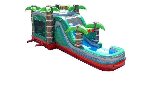 Set up a tropical paradise right in your backyard with the fabulous Mega Tropical Red Marble Wet/Dry Combo. Both children and adults will love the tall palm trees and attractive colors, and will definitely not want to come out from the bounce house and slide. The slide can be used with or without water and that’s why the inflatable comes with a special misting system that can be attached to any regular garden hose.